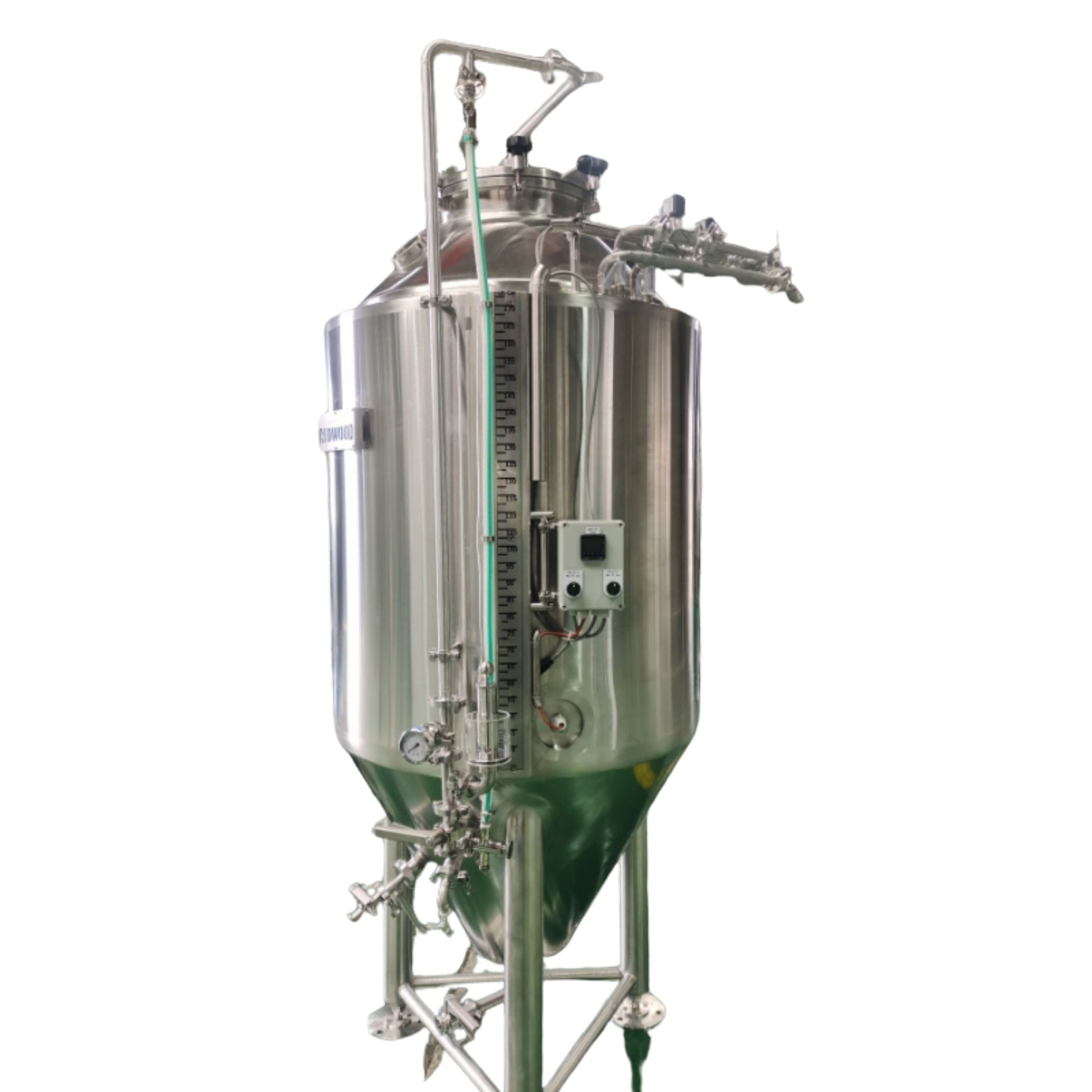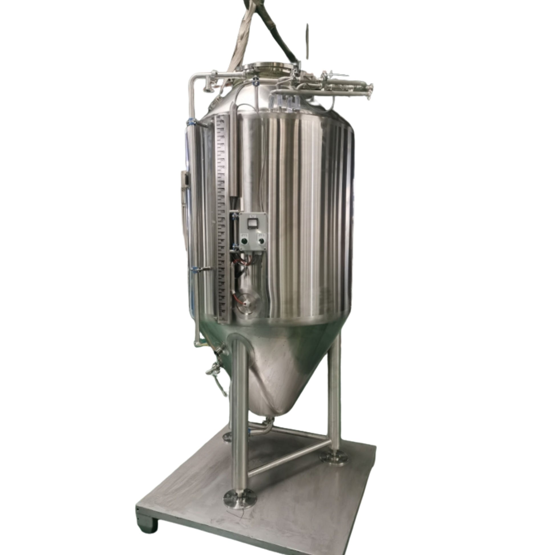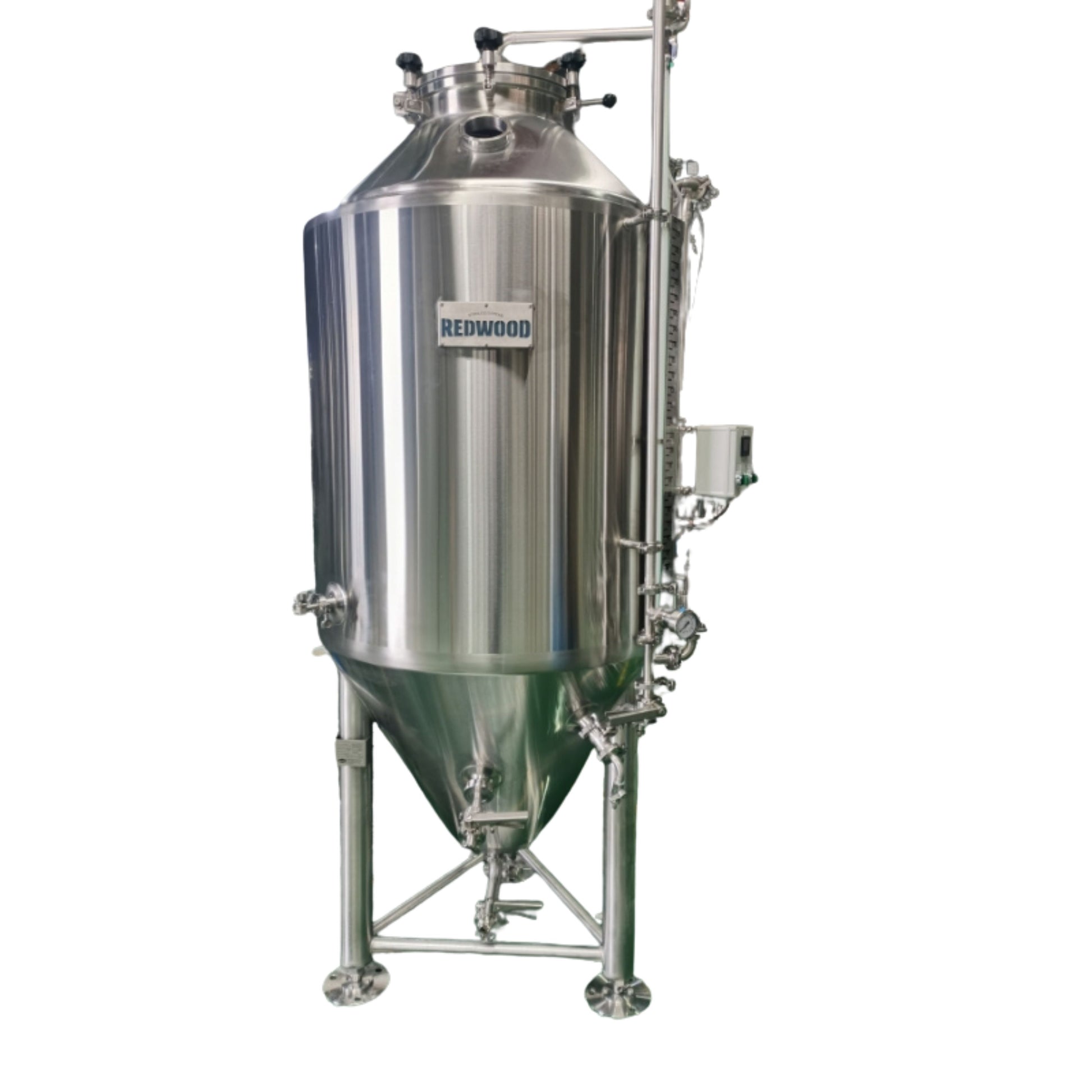 The fermenter’s customization extends to a new-style sample valve, polished head, acrylic sight glass valve, racking arm port, and union connection glycol port. It includes all necessary hygienic parts like the hop port, pressure gauge, racking arm, pressure/vacuum relief valve, and a separate CIP arm and blow-off arm, ensuring a pristine brewing environment.