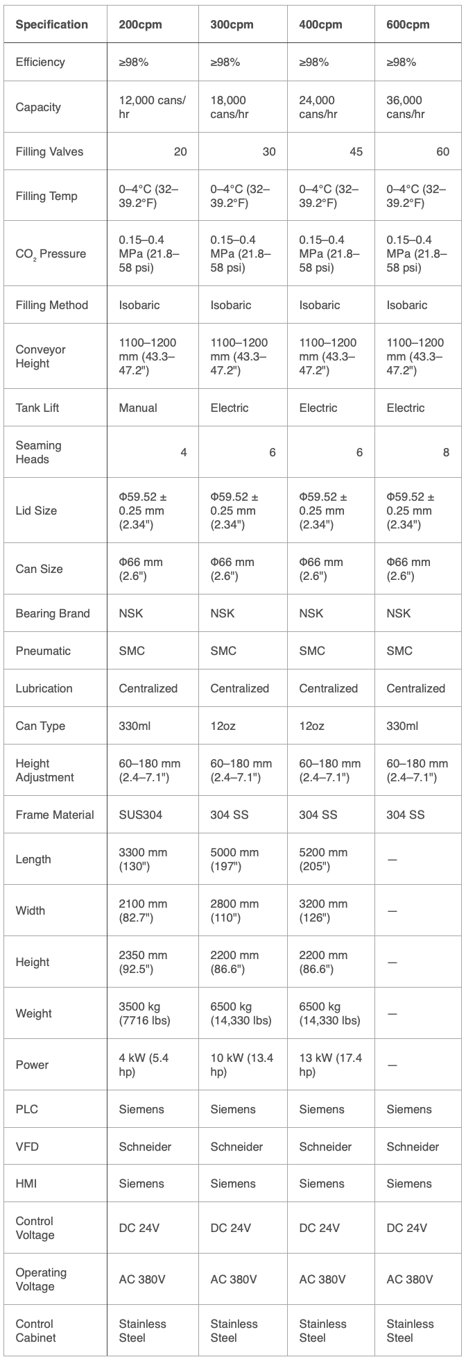 The system can reach up to 600 cans per minute (CPM) when running 12 oz cans, depending on product type, carbonation level, and operating conditions.