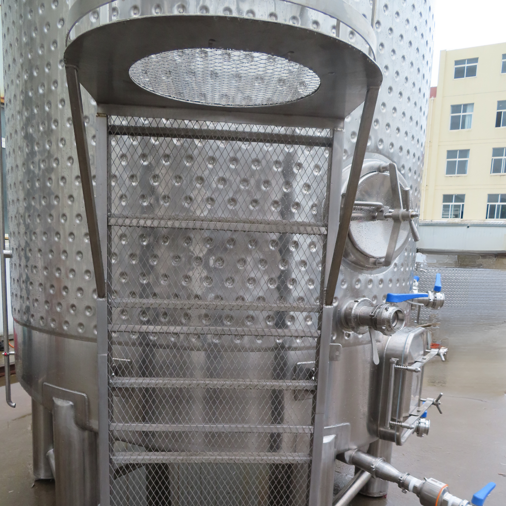 - 130% overhead space, heat insulated; separate glycol jackets on body and cone; 60°cone bottom, dished top head; Side man-way: 450mmx350mm